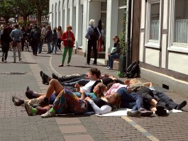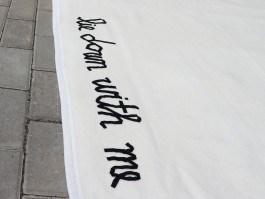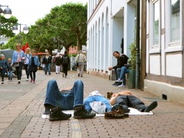 katharinajej liegt auf einer weißen Decke auf dem Gehweg inmitten der kleinen Stadt. Auf der Decke eingestickt, in großen schwarzen Lettern ist darauf genäht: Lege dich zu mir. katharinajej wartet auf Passant*innen, die sich auf eine Begegnung einlassen möchten - ein gemeinsames Liegen, Ruhen, Wahrnehmen, Sein, Nichts-Tun, auf dem Boden in aller Öffentlichkeit.