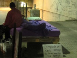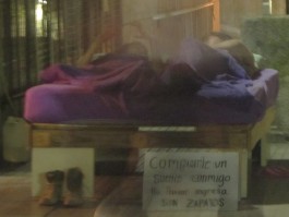 Im prekären Viertel Once in Buenos Aires, Argentinien, installiert katharinajej 2016 ihr privates Bett auf dem Bürgersteig gegenüber ihres Zuhauses. Vor dem Bett steht ein Schild, auf dem in Spanisch zu lesen ist: "Teile einen Traum mit mir. Eintritt ohne Schuhe bitte". Der Begriff sueño im Spanischen trägt eine doppelte Bedeutung: sowohl den Traum des Schlafs als auch den Wunsch.
